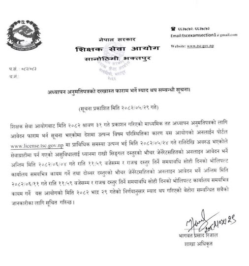 अध्यापन अनुमतिपत्रको दरखास्त फाराम भर्ने म्याद थप सम्बन्धी सूचना